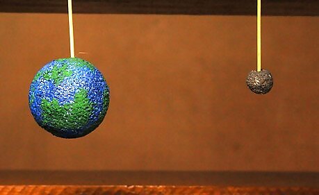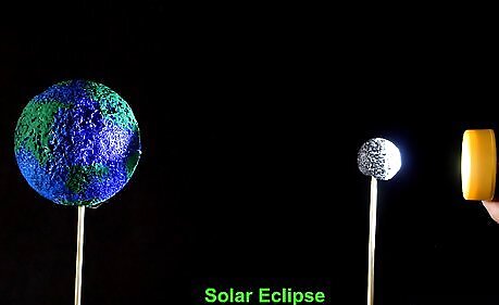 Demonstrate a solar eclipse. To do this you will need a flashlight or a lamp. Cast a solar eclipse by shining the light onto the moon ball. This will create a shadow on the Earth ball. Make sure that the lights in the room are turned off so that you can see the shadow.
