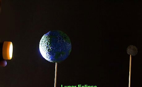 Demonstrate a lunar eclipse. To do this you will do the opposite of what you did to cast a solar eclipse. Use the flashlight or lamp to cast a lunar eclipse by shining the light onto the Earth ball. This will create a shadow on the moon ball.