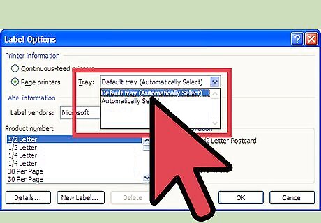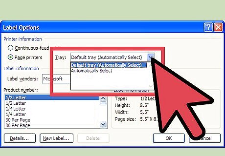 Before printing, specify your paper source Click on Options. The Label Options dialog box should appear. In the printer information section, look at the Tray pull-down list and make the appropriate selection.