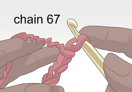 Make the foundation chain. Start by making your foundation chain. An easy way to determine how long to make your chain is to measure the chain on the person who will be wearing the capelet. Or, you can also follow a pattern to determine how long to make your foundation chain. Try using a bulky yarn with a size K hook, and then chain 67 to start. Keep in mind that the number of stitches you will need to chain will depend on the gauge of your yarn. To check the gauge, crochet a square that is 4” by 4” and then count the number of stitches required to create this length going in each direction.