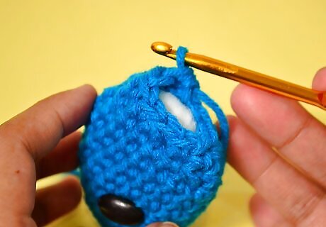 Close the base of the fish. Cut the yarn, leaving a yarn tail measuring at least 4 inches (10 cm) that you can use to close the base of the fish. Weave the excess yarn into the center of the caudal tail using your crochet hook. Catch five stitches in the center of the caudal tail using your crochet hook, then pull the excess yarn through all five stitches to tightly draw the hole closed. Pull the excess yarn through the remaining loop on your hook to form a secure knot. Weave any remaining yarn into the stitches of the tail, hiding it from sight and completing the closing process. Make sure that you have added all the plush stuffing you need to the head, body, and tail of the fish before closing it off.