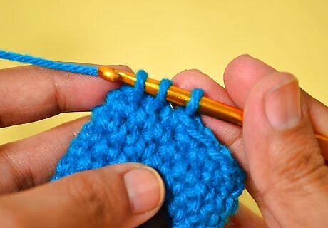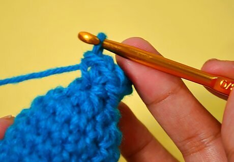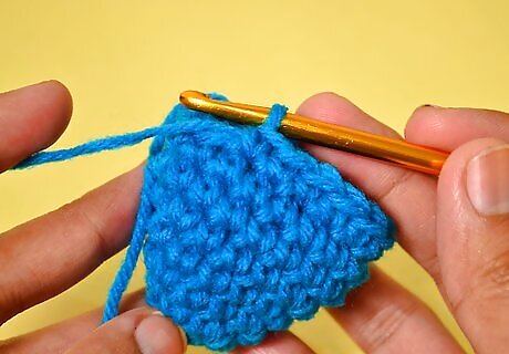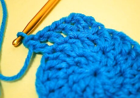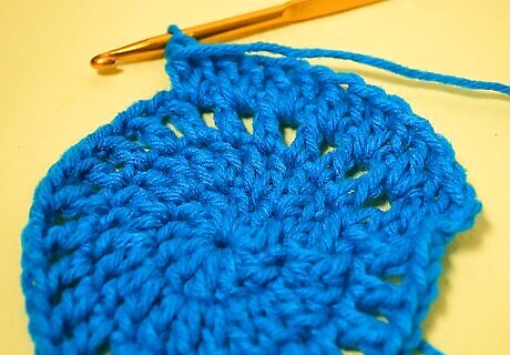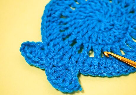 Work the fishtail. Choose any point along the outer perimeter of the fish body and tie on the yarn for your tail. Attach the yarn to the hook using a slipknot. Work one single crochet into each of the next nine spaced to form a foundation for the tail. Chain three, then turn the work before continuing. Work one double crochet into the first space and two double crochets into the space after that. Repeat as needed until you reach the last space. Chain three, then turn again. For the final row, work one double crochet into the first space and two double crochets into the space after that, as you did for the previous row. Repeat until you reach the end of the row. Cut the yarn, leaving a long tail. Pull this excess yarn through the loop on your hook to fasten off the fishtail, then weave any remaining excess into the back of your work.