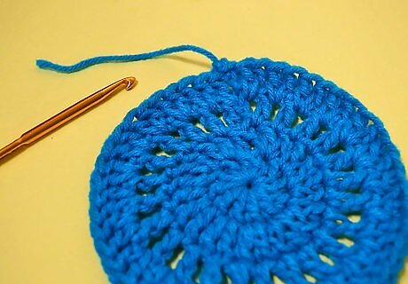 Fasten off the body. Cut the yarn, leaving a 2-inch (5-cm) tail. Pull this tail through the loop on your hook to knot off the work, then weave any excess yarn into the back of the project. This step completes the body of the fish. You should have a standard round dishcloth at this point.