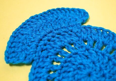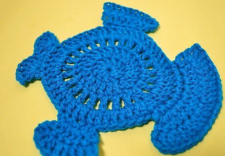 Make a fin on the top and bottom. Fold the body of the fish to find the center top of the circle. Attach the yarn to the body and to your hook, then crochet the fin. When finished with the top fin, repeat this procedure to find the center bottom of the body and work the bottom fin. For each fin, work five single crochets into the body, moving from right to left. Turn the work, then chain three. Work one double crochet into the first space and two double crochets into the next space. Repeat across the row, then chain three and turn the work. Work one double crochet into the first space and two double crochets into the space after that. Repeat across the row to finish it. Cut the yarn and draw the excess through the loop on your hook, tying it off. Hide the remaining yarn in the back of the work. Once you finish the top and bottom fins, your project is complete.