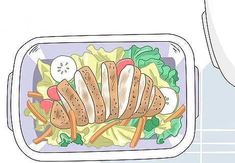 Order or prepare your lunch on a bed of greens. One of the best ways to immediately improve your diet in general is by eating a salad for one of your meals everyday. You can still include the high protein ingredients you might usually eat on a sandwich, such as tuna tuna, chicken, or egg salad. Season salads with olive oil, vinegar, and pepper instead of packaged dressings. Even if you’ve been loyal to the classic turkey and cheese sandwich every weekday for a decade, you don’t have to fully abandon your go-to flavors. In fact, turkey, goat cheese, and cranberries go especially well on a bed of dark greens, such as kale or spinach.
