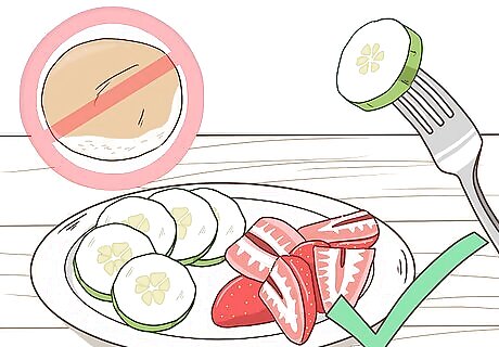 Snack on fruit and veggies. Bread gets a lot of love in part because it is cheap, filling, and easy to carry and snack on. Of course, there are other healthier food categories that offer these benefits as well. Get in the habit of snacking on fresh fruit or slices of cucumber or bell pepper instead of a roll or other bread item. Raspberries, blackberries, and pears are especially high in healthy, filling fiber. For an extra flavor burst, dip veggies in hummus. This snack will offer the satiating effects of fiber that will quickly quell any mid-afternoon hunger.