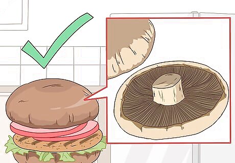 Use a mushroom cap instead of a bun. While lettuce wraps can be a great substitute for a sandwich on bread, you may simply prefer squeezing your burger between two soft, rounded layers of something a bit more substantial. Believe it or not, a bread bun isn’t your only option. Portobello mushroom caps not only offer the shape of a classic bun, they are hearty and filling. Roast the caps in the oven at 375 degrees F (191 degrees C) for a few minutes, until they begin to brown. Then use them exactly like you’d use a bread bun. Note that you can also make personal pizzas on portobello caps.