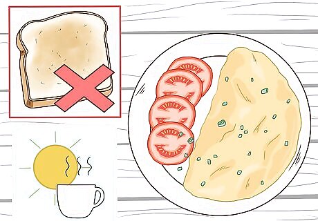 Pass on toast at breakfast. Toast and other bread type breakfast foods are common in many people’s diet, as they are quick and easy to prepare. There are many healthier breakfast options, however. In particular, opt for eggs with veggies and your favorite herbs. To save time in the morning, cut veggies and scramble your eggs the night before. Store everything in the fridge, and you can cook them up on a well-seasoned skillet in no time. If you’re accustomed to eggs with a side a toast, swap out the toast for a half baked sweet potato or a side of steamed veggies. Plain, low-fat Greek yogurt is another great breakfast option. Stir in some fresh fruit and honey to sweeten.