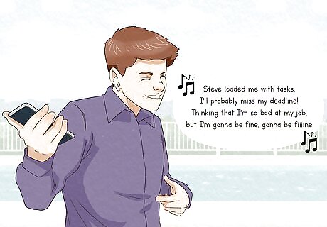 Turn your negative thoughts into a song. Sometimes you can address and a correct a negative thought by making a joke out of it. As silly as it sounds, you may be able to dispel your negative thoughts by singing about them. Use the tune of a familiar song, such as "Row, Row, Row Your Boat," or the alphabet song to turn your negative thoughts into a song. If you don’t feel like singing, you can say your thoughts out loud in a funny voice, like a cartoon character.