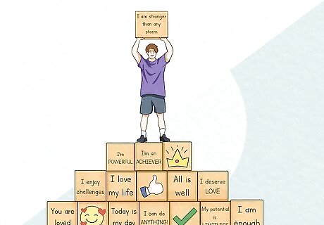 Use positive daily affirmations to build yourself up. Positive daily affirmations can help you to deal with the negative emotions that often accompany negative thoughts. Take a few moments every day to look at yourself in the mirror and say something encouraging to yourself. You can either say something that you believe about yourself or something that you would like to believe about yourself. Some examples of positive affirmations include: “I am intelligent.” “I am a caring friend.” “People enjoy spending time with me.”