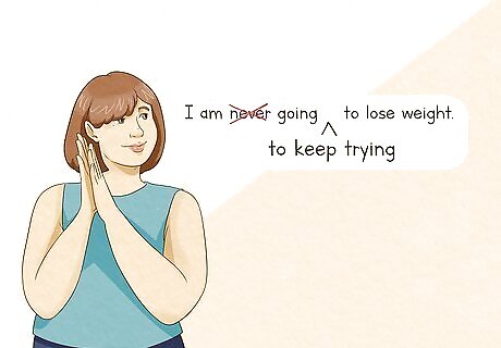 Reframe negative thoughts as they occur. To begin using positive self-talk, do not allow a negative thought to go by without reframing it as something positive. This process might seem awkward at first, but over time it will become easier and you will begin to develop a more positive outlook. The next time you have a negative thought, turn it into a positive one. For example, if you think to yourself, “I am never going to lose weight.” Force yourself to reframe the thought into a positive statement. Say something like, “I am going to keep trying to lose weight.” By changing the negative thought into a hopeful statement, you are forcing yourself to focus on a positive part of the situation.