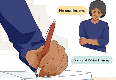 Determine what type of negative thoughts you are having. Reconsider the most common types of negative thoughts to help you determine what category your thoughts fall into. Identify the type(s) of thoughts that you are having and label them as such in your thought record. For example, if you often think to yourself “I am stupid,” then you might label this thought as “Black and White Thinking” because you are ignoring things that you do well.