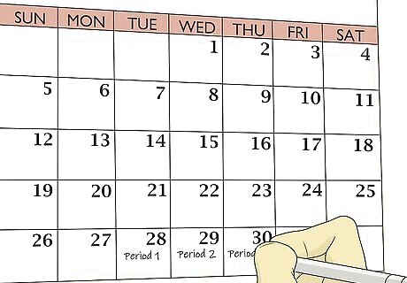 Track your menstrual cycle so you can guess when it’s coming. In addition to knowing the warning signs that your period is coming, it can help to have an idea of how far apart your periods tend to happen. For example, they may start every 28 days or every 30. Once your period starts, mark the first day down in a calendar or ask a family member or friend to do it for you. Do this every month until you have a sense of how many days tend to go by between the start of one period and the start of the next one. You can also use an app to help you track your periods. Some popular period tracking apps include Clue, Eve Tracker, and Flo. If you have really irregular periods, you might have to rely on other clues, like the symptoms you tend to get when your periods start.