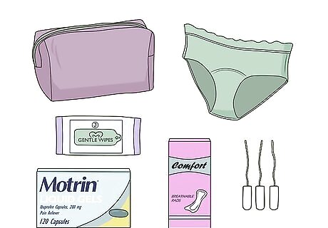 Put together a special period supply kit. Putting together a kit and keeping it with you can help you be prepared in case your period starts unexpectedly. Carry it with you in your purse or backpack so that it’s always on hand if you need it. Consider filling it with supplies like: Pads, tampons, or pantyliners A washcloth or some gentle disposable wipes A change of underwear Stain-removing sticks or sprays in case of leaks Small baggies for disposing of sanitary napkins or tampons Pain relief medications to relieve cramps, such as ibuprofen (Motrin), naproxen (Aleve), or Pamprin