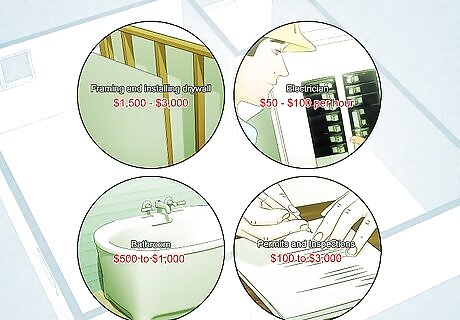 Finish your basement if your budget allows. Figure out what you can afford, then plan your project's scope accordingly. Depending on your basement's condition and your expectations, it could cost anywhere between $6,000 and $20,000 (USD) to finish it. If you're going all out, your budget should be about 10 to 15 percent of your home's value. Specific expenses depend on the project. Framing and installing drywall can cost between $1,500 and $3,000, depending on the area's size. Adding a ceiling will cost another $1,250 to $1,500. Expect to pay an electrician $50 to $100 per hour. A large project, like an entertainment room, can run between $2,000 and $4,000. If there's existing plumbing, a bathroom could cost $500 to $1000. However, building a full bath from scratch will cost at least $6,000. Settling for a half bath can help trim your budget. You'll also need permits and inspections, which can add anywhere from $100 to $3,000.