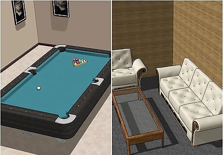 Turn your basement into a space that fits your needs. You might be able to create multiple rooms if your basement and budget are large enough. If you're working with limited space and funds, create a single room that suits your lifestyle. It should get enough use to justify the cost of decorating it. For instance, create a family room if you want a cozy hangout spot. If you work from home or need a more productive space, turn your basement into an office. You could set up a game room or bar if you love entertaining guests or want to decorate the space around a pool or ping pong table you already own.