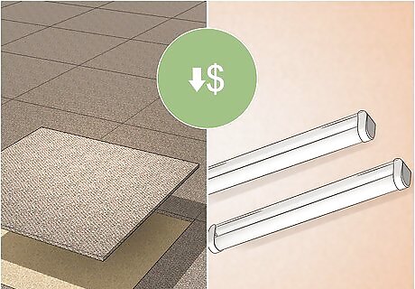 Make easy, inexpensive upgrades if you have a smaller budget. For a smaller price tag, make quick, inexpensive fixes to an unfinished or partly finished basement. Cosmetic fixes include carpet tiles or area rugs, furniture and accessories, and easy lighting upgrades. A rug or carpet tiles can cost around $100 to $200 (or more, depending on quality and coverage area). Quick lighting fixes, like string and tube lights, should cost less than $100. New furniture and accessories could cost hundreds or thousands of dollars, but buying secondhand pieces will cut your costs.