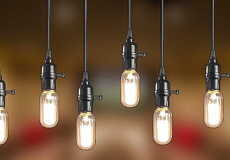 Improve lighting with industrial string lights and clip-on shades. Small windows (or none at all), scant light fixtures, and bare light bulbs make most basements feel gloomy. Hang industrial light strings or lighting strips along support beams to brighten up the space. Covering bare bulbs with clip-on shades will lend them a cleaner look and soften the light they emit.
