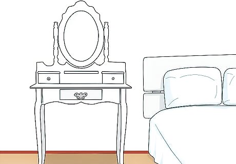 Pick out a table that suits your needs. Almost any type of compact table or desk can be appropriated for this purpose, so explore several different options and go with one that looks the most natural in the space you’re decorating. It’s also worth putting some thought into any additional features you might want, like drawers, cabinets, or built-in lighting elements. The table you choose should be low enough to avoid looking out of place for it’s intended use, but high enough to sit at comfortably. Extra storage space can be a major plus if you have a habit of stockpiling cosmetics or prefer to keep all of your beauty supplies in one place.