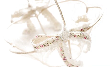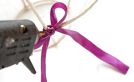 Attach the ribbon. Tie lengths of narrow ribbon at each base (or just one) of the basket handle, or use a hot glue gun to attach them if you prefer. The ribbons should trail approximately 6 to 10 inches (15.2 to 25.4 cm) below the bottom of basket. You can also tie ribbon bows. These bows will cover any knotted portions of the narrow ribbon streamers.