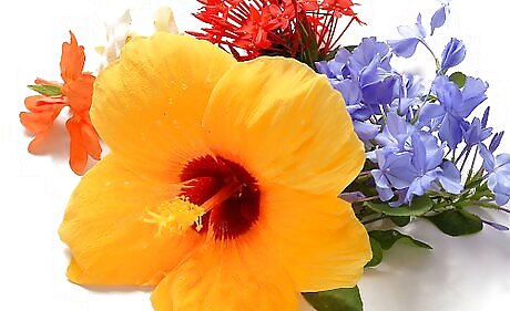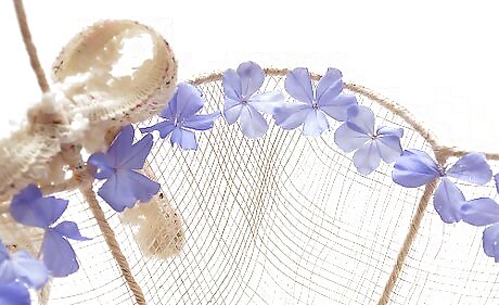 Attach the flowers. Either cluster the flowers on each side of the basket or attach flowers all along the basket's rim or edge. You can attach artificial flowers and greenery by weaving their stems through the open spaces in the basket. The ease with which this is accomplished depends on the structure of the basket. Alternatively, you can use a hot glue gun to attach artificial flowers. If you’re using fresh flowers, try tying them to the basket with floral wire. Simply, position the flowers on the exterior of the basket, then pass both ends of a length of floral wire over the stem and through to the interior of the basket. Finish by twisting the wire ends to secure them and tuck them back into the basket so that they are hidden. You can also try covering the entire basket with flowers and greenery, or cascade them down one side with hot glue.