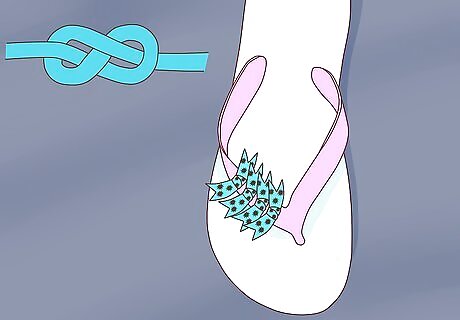 Tie the fabric or ribbon onto the straps of your flip-flops. Position the middle point of the strips under the straps of your flip-flops. Then, tie a double-knot to secure the fabric in place. Pull the knot firmly to make sure that it is tight. Tie half the strips onto 1 strap and then tie the other half onto the second strap. Any secure knot will work for this task. Feel free to use your favorite.