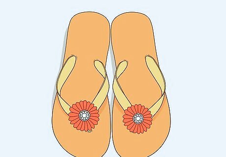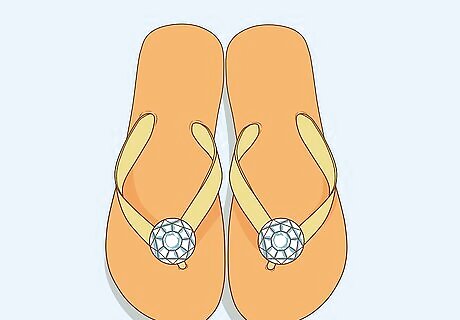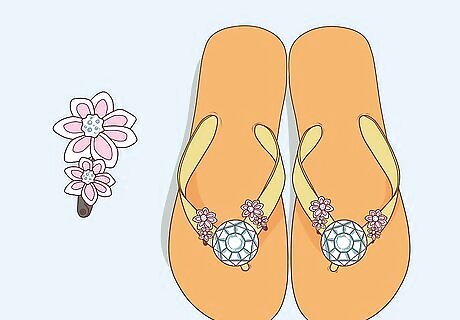 Put a hair clip onto the straps of your flip-flops to personalize them. Choose a hair clip that snaps closed and clip it onto the strap of your flip-flops. Put as many clips on as you desire! Try your flip-flops on and, if necessary, adjust the positioning of the clips so they're more comfortable. This works best with small clips, as larger barrettes tend to dig into your feet. Purchase hair clips from dollar stores or online. Consider using hair clips with flowers, animal figurines, or pom-poms on them. If your hair clip doesn’t have a clip, stick it on with superglue instead.