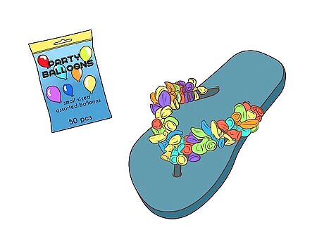 Use small balloons instead of ribbon or fabric for a bright colourful look. Place a 1.5 inches (3.8 cm) balloon under the strap and double-knot it above to secure it in place. Repeat this process with small balloons until all the straps are covered. You will need about 40 balloons to cover adult-sized flip-flops. If you don’t have any small balloons, use water balloons instead. Don’t blow the balloons up.