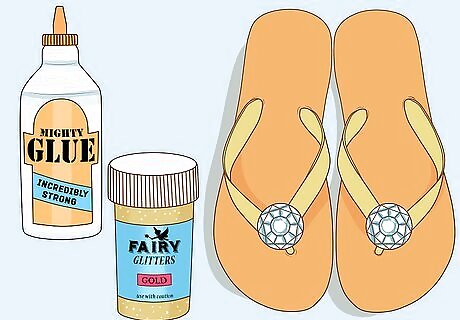 Add glitter to your flip-flops for a sparkly look. Drizzle a thin layer of super glue on the areas that you want to look glittery. Then, sprinkle your favorite glitter over the glue. Wait 15 minutes for the glue to harden and then shake any excess glitter off the shoes. Gold and silver glitter looks fantastic with all different colors of flip-flops. Sprinkle the glitter outside or over scrap paper to avoid making a mess inside.