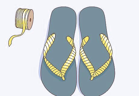 Glue ribbon onto the straps to change their color. Place a small dab of super glue on the bottom side at the base of 1 of the straps. Stick the end of the ribbon onto the glue and then wrap the ribbon over the entire strap. When you wrap, overlap the ribbon to ensure that it covers the entire length of the straps. Once you reach the end of the straps, cut the ribbon and glue the end in place. Repeat the wrapping process on both straps. Any type of ribbon will work for this activity. Use a full spool of ribbon to ensure that you have enough to wrap around both your straps, especially if you’re decorating adult-sized flip-flops. You can add a cute touch to these flip-flops by tying a bow with any leftover ribbon and gluing it to the point where the two straps meet (between your big toe and the next toe.)