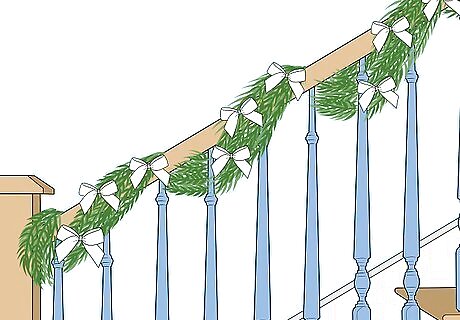 Tie bows along the railing. Every 2 to 3 feet (0.61 to 0.91 m), add a decorative bow out of wide ribbon. This also works well if you've hung a garland already, as it helps complete the look. Keep the ribbon all in one color scheme to help bring the look together. For extra pizzazz, wrap a wide ribbon in the same color all along the garland before adding bows.
