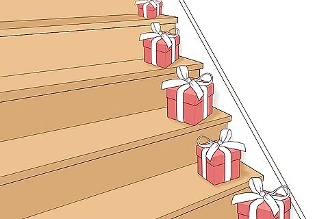 Place 1-2 wrapped presents on each step. Aim for presents in a single color scheme, such as red and white. Go over the top with bows and ribbons on the presents and stack a couple on top of each other for even more fun. Make sure to set them over to the side so people don't trip on them.