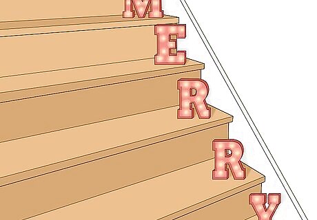 Spell out a Christmas-themed word in marquee letters. You can find these at most craft stores or you can even make your own with handmade cardboard letters and small strands of battery-powered lights. Set one letter on each stair to spell out something meaningful to you. For instance, you could write words like, "Ho, ho, ho," "Joyful," "Merry," "Home," or "Celebrate," just to name a few.