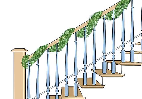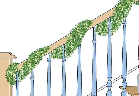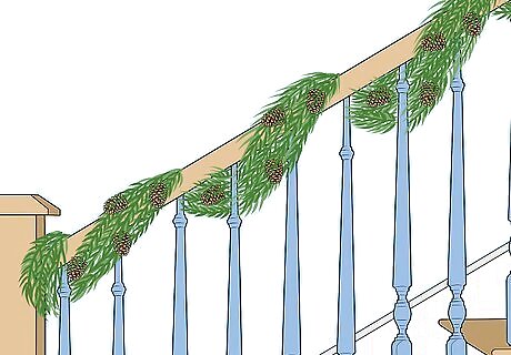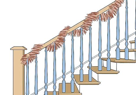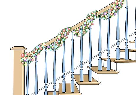 Wrap lights around the garland or just the railing. Lights are a great way to make any area festive. If you've already put up a garland, simply wind the lights around it, making sure to keep them even. If you just want lights, start at the bottom of the railing and wrap them around the railing every 1 to 2 inches (2.5 to 5.1 cm). You may need 3-4 strands to cover a railing, depending on how long they are.