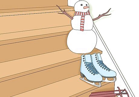 Put a different decorative item on each step. Try to pick a theme, such as playing in the snow. Then you can add things like a pair of old fashioned ice skates, a snowman, a small sled, and/or a collection of snowflakes. Alternatively, put a different style Santa on each step or Santa at the top of the stairs with a reindeer on each step. If you have a landing in the middle of the stairs, try grouping a small collection of items in this corner.