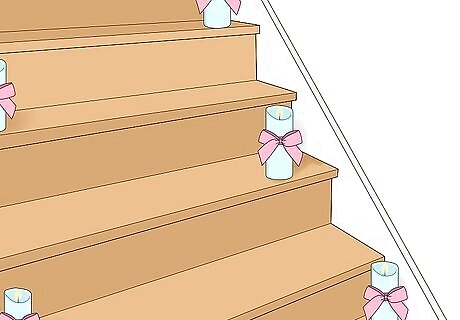 Light up the staircase with fake pillar candles. Tie a bow around each pillar candle in the color scheme of your choice. Set one candle on each step or even line both sides with candles, alternating sides each time. Real candles pose a fire risk, particularly if you have children or animals in your home.