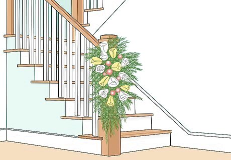 Add bits of white to green to make it seem snowy. For instance, add silk flowers like baby's breath, roses, mums, or tulips along a garland in bunches to help create the illusion of snow. You can also create bouquets of evergreens and flowers to hang evenly spaced along the railing instead of a garland.