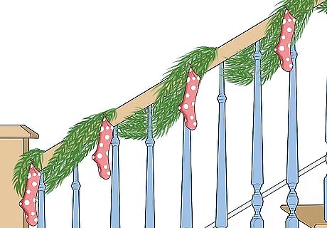 Hang the stockings along the staircase for a simple, classic look. This works especially well if you don't have a fireplace or mantel. Just hang the stockings every 1 to 2 feet (0.30 to 0.61 m) with a hook that fits over the railing. It doesn't hurt to add other touches around the stockings, such as ribbon bows or bouquets of evergreen.