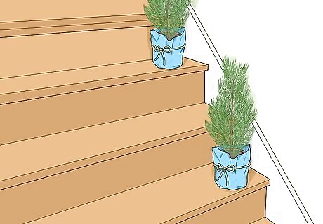 Add mini evergreens along the steps for a fresh look. Find small, potted evergreen plants, either fake or real. Wrap the bottoms in a square of fabric; you can use muslin, burlap, plain cotton, or a patterned cotton. Then tie the fabric on with a piece of twine or ribbon. Place one on each step or every other step. Just try to keep all the fabric in the same color scheme! Alternatively, try small pots of poinsettias. Keep in mind, though, this plant is toxic to most animals, so choose fake flowers if you have furry friends in the house.