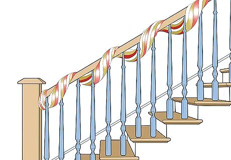 Twist together wide ribbons and beaded garlands for a customized style. Pick wide, wired ribbon in colors you like, such as a mixture of reds, golds, and whites. Loosely twist them together to form a garland, and then wrap a beaded garland around it if you desire. Tie it together as you hang it and drape it evenly along the railing. You could also try making a large, very loose braid with the ribbons.