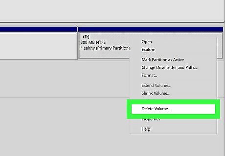 Click Delete Volume. It's in the pop-up menu that appears when you right-click on a drive in the Disk Management app. This deletes the drive. The new free space will be unallocated. Warning: This will permanently delete all the data on the partition. Make sure you backup any files you want to save to another drive before you delete the partition. Note: You cannot delete a drive that has your Windows installation on it.