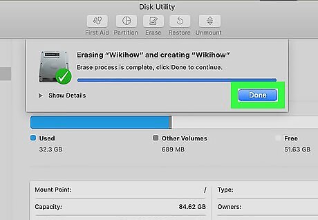 Click Done. Once your computer is done erasing the drive, click Done to close the pop-up window. Your partition has been erased. If you still want to use the partition, no further steps are needed. If you want to remove the partition, continue to the next step.