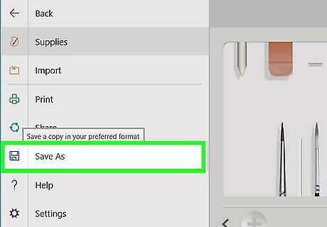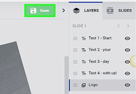 Save your logo. Once you’ve got your design looking the way you want it, highlight the “File” tab in the upper lefthand corner of the screen and select “Save." You’ll be prompted to choose a name and location for the new image on your computer. Give your logo a name that will help you remember what it is, then hit the “Save” button again to finish creating the image. Click the dropdown list underneath the bar for the file name to choose your desired file format. Extensions like .jpeg, .gif, and .png are common, and will be acceptable for printing and uploading in most places. If you’re editing on a mobile device, you’ll see an option that reads “Save/Export to gallery/camera roll.”