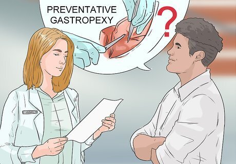 Ask your vet about preventative gastropexy. Preventative gastropexy is a surgical procedure that can be performed on dogs that are prone to bloating and torsion. There are a few different procedures when performing gastropexy, but most result in adhering part of the dog’s stomach to their torso to prevent torsion.Consult your vet to see which gastropexy options are available and which might be most effective for your dog.