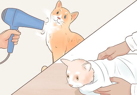 Dry your cat. Use a dry towel or a hand dryer on a low setting to dry your cat. You may need to use a few towels to get them completely dry. If you use a hair dryer, avoid putting it too close to their fur or on a high setting, since you don’t want to burn them. If you dry by hand, you need to be gentle because your cat is in a very vulnerable state.
