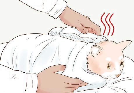 Heat up key areas with a heat pack. Use a heat pack or soda bottle filled with warm water to heat up vital areas, such as the head, neck, armpits and groin. When you apply the heat pack or soda bottle, use a gentle approach and make sure it is not so hot that it will burn your cat. Wrap up heat packs and hot water bottles in towels before giving them to the cat. Never apply these directly to the cat as they could burn or overheat the cat.