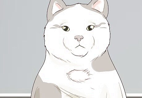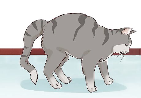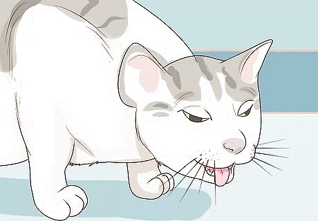 Watch for your cat resting in odd positions. Because your cat is having trouble breathing, you may notice it's sitting in odd positions. It may take a "bulldog stance," with the front legs wide apart. You may notice the cat has trouble sleeping because it has to keep sitting up to breathe easier. It may also take a hunched-over position.