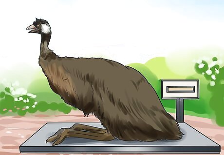 Weigh your emu. Significant weight loss can be a symptom of fowl cholera, as well as a sign of tuberculosis. If this is the case, you should check with your vet. Healthy weights in emu range from 90 to 150 pounds. You can use a platform scale and do scale training to get your emu to stay on the scale long enough to weigh them. Platform scales that can handle the weight of an emu can cost anywhere from just over a hundred dollars to over a thousand. It might be a good idea to get a textured-surface scale so that your emu finds it easy to walk on it without slipping.