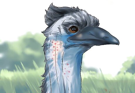 Check to see if they skin is bluish-purple. You can check this by parting the feathers. The skin on an emu's head is normally a mix of black, tan, blue, and white, and the rest of the skin is pinkish. Bluish-purple skin can indicate a lack of oxygen. This symptom appears frequently with Avian Influenza and Newcastle disease. Blue discoloration of the skin, or cyanosis, also occurs with Aspergillosis. If you suspect a bird is sick, it is best to use gloves when examining it.