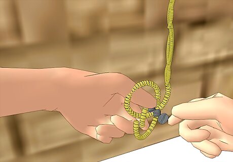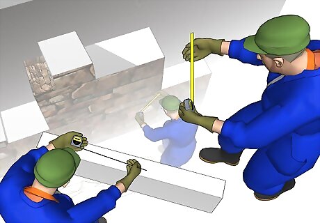 Before you mix any cement, look at your wall and think about what you might need. If it's a pillar or something that has a corner, then you're going to have to string a line or a series of lines. This means you'll need a tightly strung string that is strung from above where you're working and all the way down to the bottom at a specific measurement. So suppose you're wrapping your stone around a pillar and your distance is two and a half inches away from the wall; cut a 2x4 at about a six inch length. Then get some particle board and cut it in a long strip. Drill the six inch long 2x4 to the particle board with two screws so that the tension in the line doesn't cause the 2x4 to pivot. Drill the particle board to the wall. Measure from the two walls two and a half inches and make those measurement marks on the 2x4. Extend those marks with a square to the point to where the measurement marks intersect. Drill a screw into that intersection point, but don't drill it 100% into the wood. Leave some of the screw out a little ways. Now, tie a stiff and durable string to that screw you just drilled. Make sure that the string reaches all the way to the bottom with a little extra remaining.